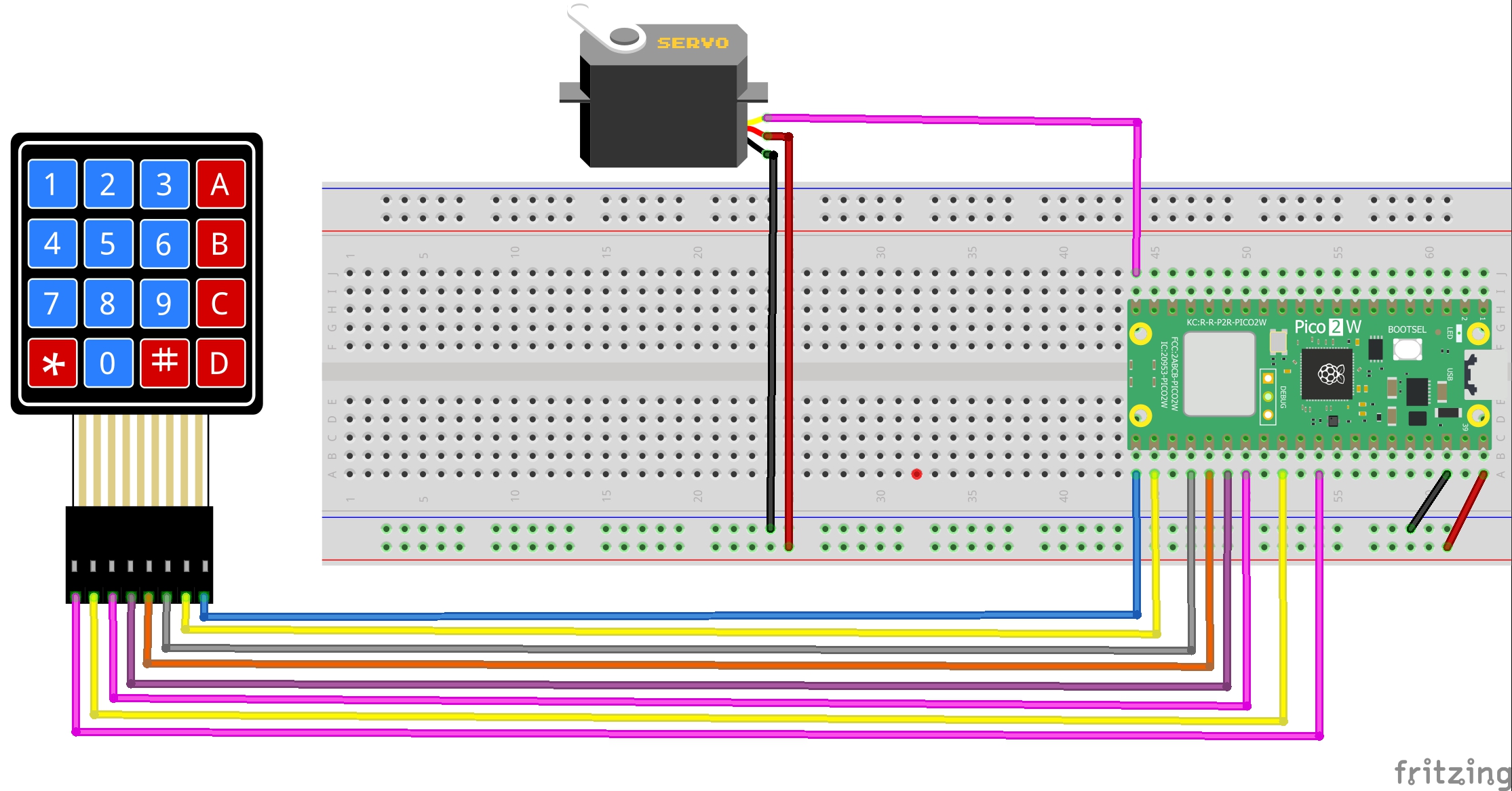 قم بتوصيل الأسلاك بين لوحة راسبيرى باى بيكو 2W ولوحة المفاتيح ومحرك السيرفو كما فى الصورة التالية :